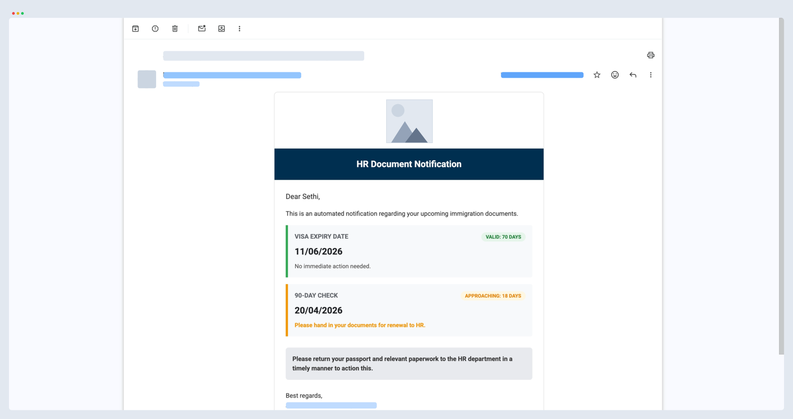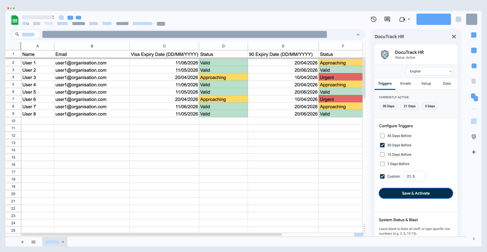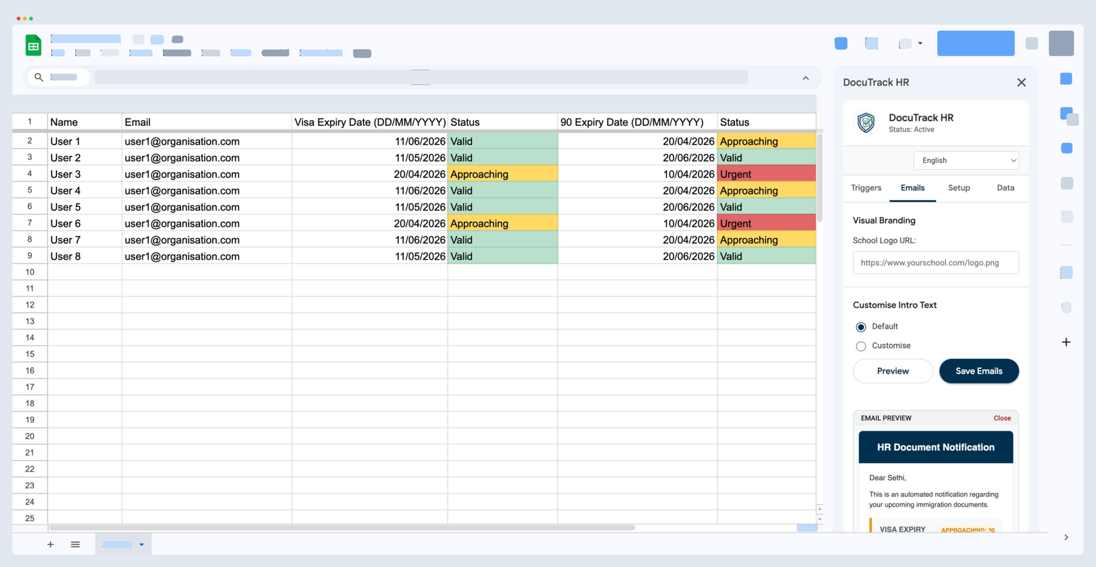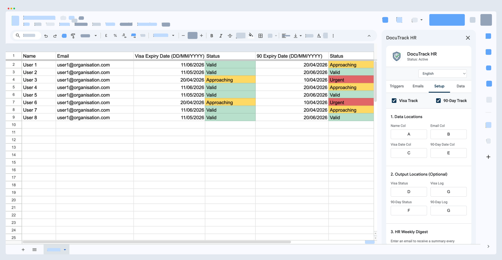 DocuTrack HR is an enterprise-grade Google Sheets™ Add-on that quietly monitors employee visas, work permits, and 90-day reports, automatically emailing staff before critical documents expire.